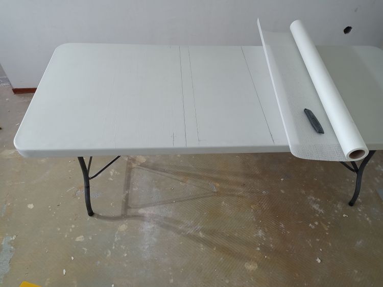 Zodra je het plaksel klaar hebt kan je behangrollen klaarmaken. Deze stap kan je ook overslaan als je liever de rollen op maat maakt zodra je er aan toe bent. Liever zet ik alle rollen al klaar zodat ik weet hoeveel ik gebruiken ga en of ik voldoende behang heb gekocht. Meet de hoogte van de te plakken muur, ik kwam uit op 260 cm. Voordat ik ga snijden zet ik de behangtafel klaar en zet ik een streepje op de tafel op 1 meter vanaf de lange zijde. Vervolgens pak ik een liniaal of waterpas en trek ik die lijn door op de tafel zodat ik vanaf de lange zijde van de tafel een loodrechte lijn van 100 cm op de tafel heb. Dit doe ik ook op 70 cm.