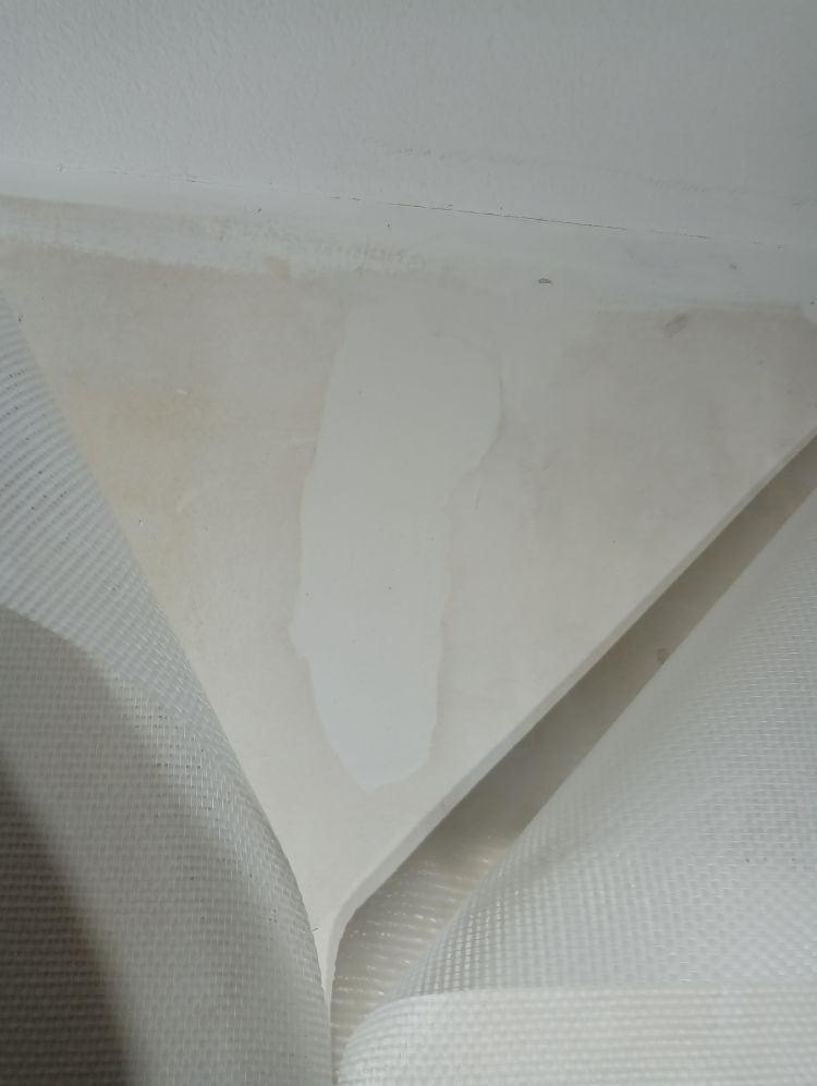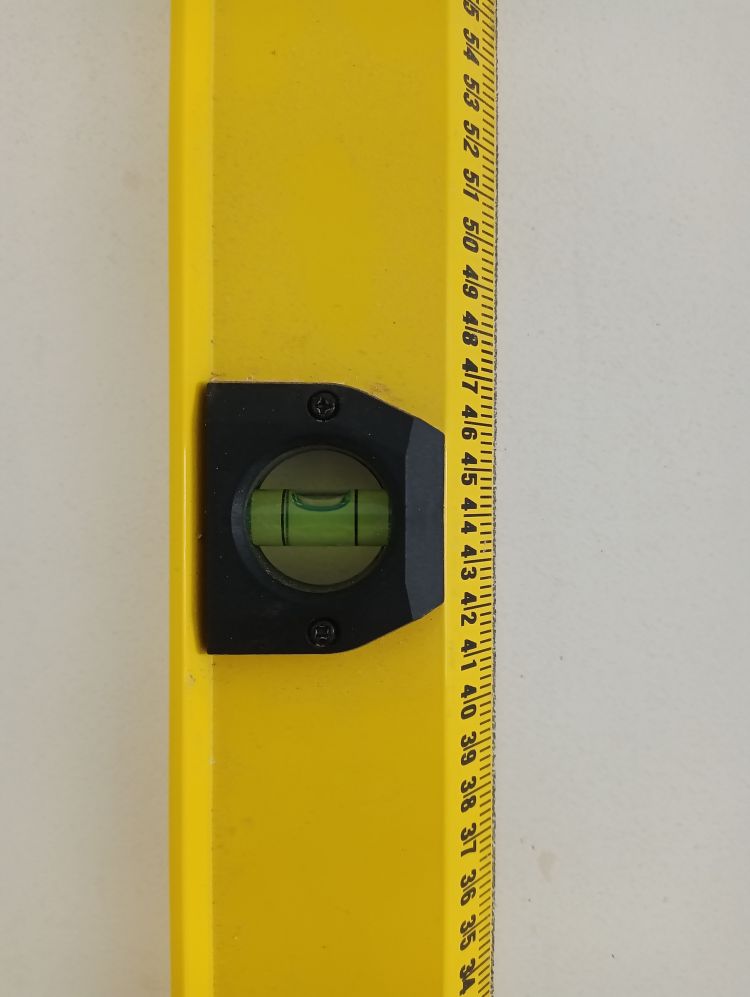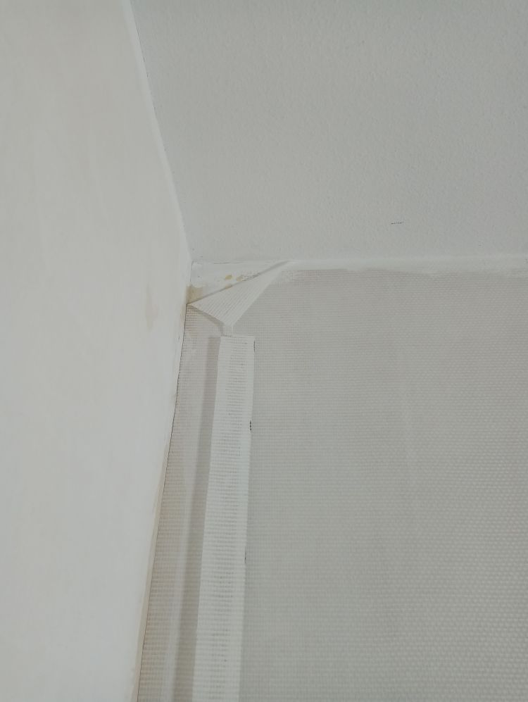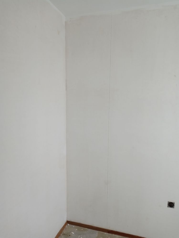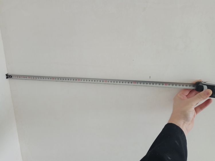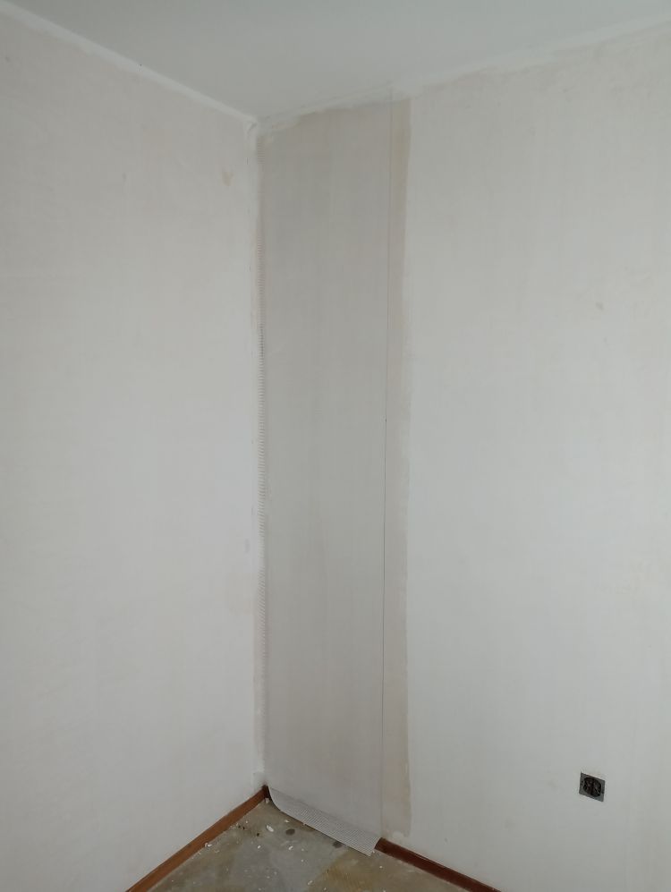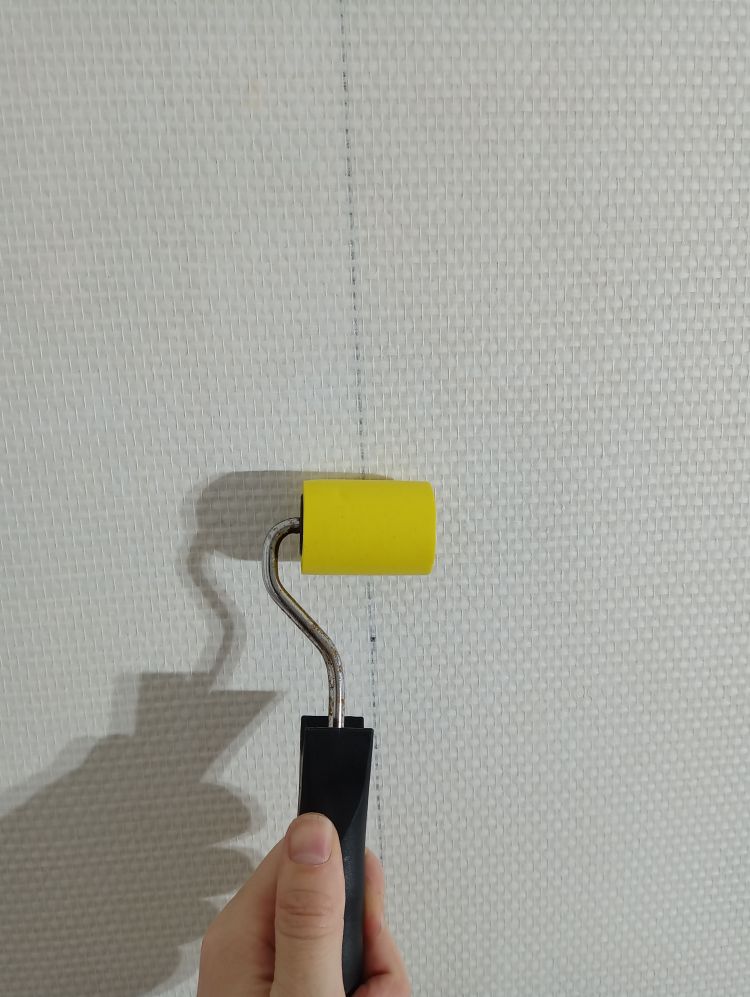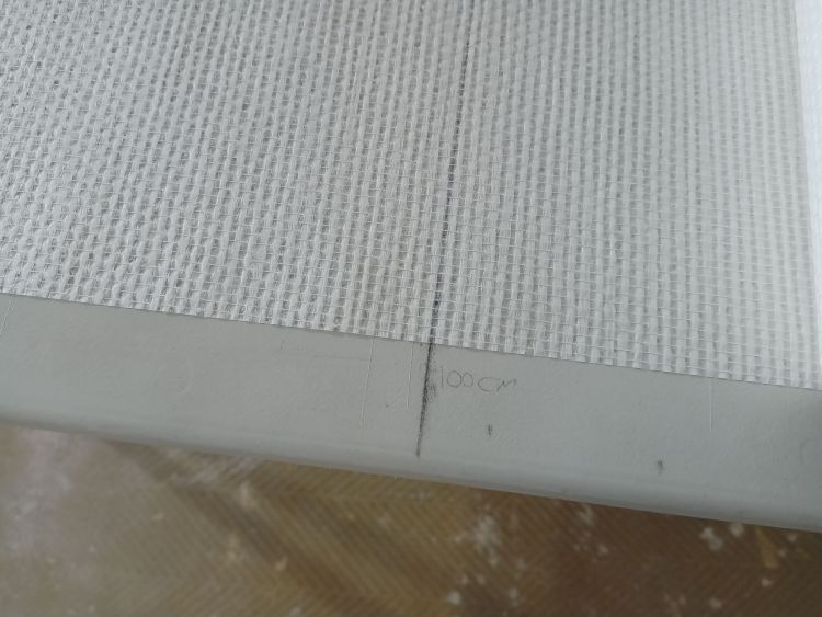 Onthoud dat de eerste baan het belangrijkste is van de hele muur. Deze moet goed geplakt worden anders krijg je problemen op de rest van de muur. De eerste baan moet loodrecht geplakt worden. Ga als volgt te werk: begin in een makkelijke hoek zonder al te veel moeilijkheden zoals stopcontacten en plekken waar geen behang geplakt moet worden. Pak je rolmaat en zet een verticaal streepje op 95cm vanuit de hoek op het midden van de muur (in de foto 55cm). Pak vervolgens je waterpas en zet zorgvuldig een lichte potloodstreep loodrecht over je aangebrachte streepje zodat er een loodrechte lijn ontstaat van het plafond tot aan de grond. Tegen deze deze lijn ga je de eerste baan plakken. Een standaard rol glasweefsel is 100 cm breed en door vijf cm uit de hoek te beginnen zorg je ervoor dat een eventuele scheve hoek (lees niet waterpas) er niet voor zorgt dat je baan schuin loopt.