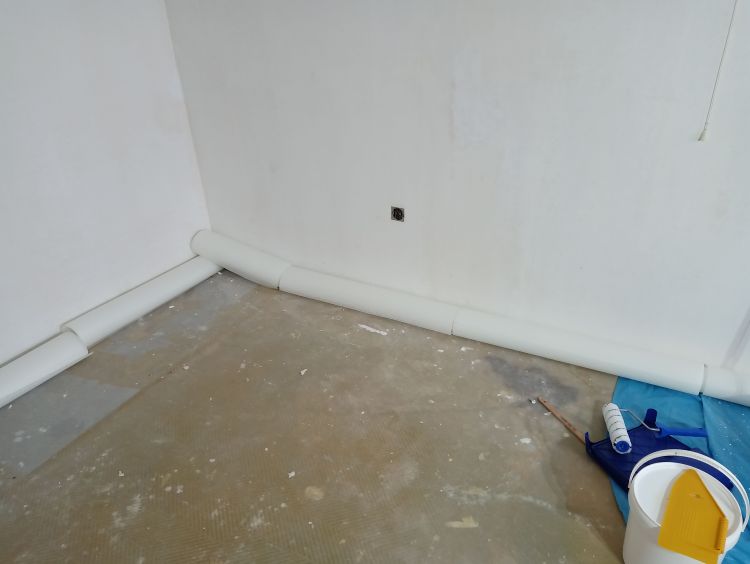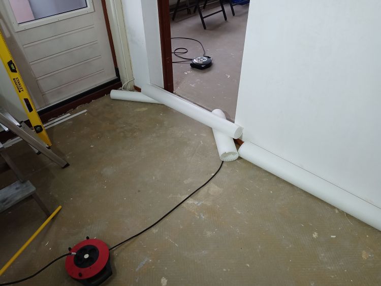 Zodra de baan achter de buizen/het obstakel tegen de muur aangeplakt zit, kan je de randen gaan afsnijden, voordat je verder rondom het obstakel gaat snijden. Door de baan eerst te plakken en op maat te maken kan je daarna beter inschatten wat je wel en niet moet wegsnijden rondom het obstakel. Wees ook niet te bang om ergens te ver in te snijden. Als je ergens snijdt en je bent te ver doorgegaan, dan plak je deze twee helften weer terug en je zult er weinig tot niks van zien in het eindresultaat.