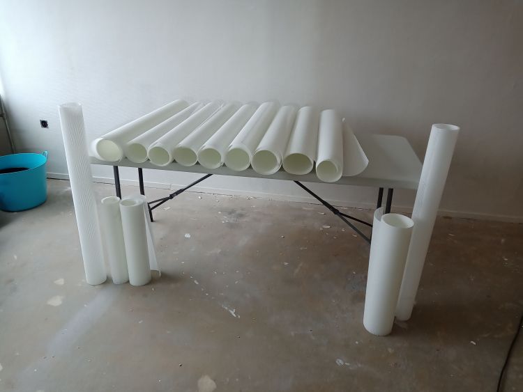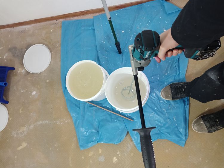 Net als de voorstrijk kan je het plaksel beter minimaal één dag van tevoren mengen. Ik gebruik per tien liter water drie pakjes behangplaksel voor zwaar behang (poeder). Weer hetzelfde als bij de voorstrijk, doe ik eerst het water in de emmer en begin ik met mengen, daarna strooi ik de poeder uit over het water. Drie pakjes op tien liter water is een sterk plaksel en dit is ook nodig voor glasweefsel. Het mixen van de eerste twee pakjes gaat relatief makkelijk, maar bij het derde pakje zal je veel weerstand krijgen, dus daarom raad ik echt een boormachine met mengstaaf of een mix-apparaat aan. Als je het mengsel maakt met een boormachine/mixer, dan hoef je eigenlijk maar één dag van tevoren de mix te maken.