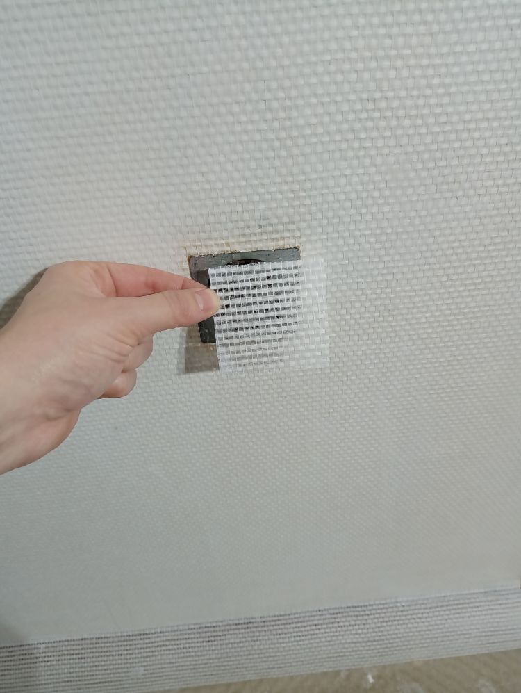 In deze baan behang zit een stopcontact. Zoals je kunt zien in de foto’s heb ik (na het uitschakelen van de spanning) het stopcontact verwijderd en heb ik over het contact heen geplakt. Als de baan goed geplakt is, kan je het stopcontact uitsnijden.