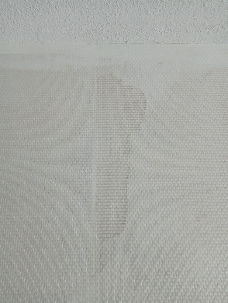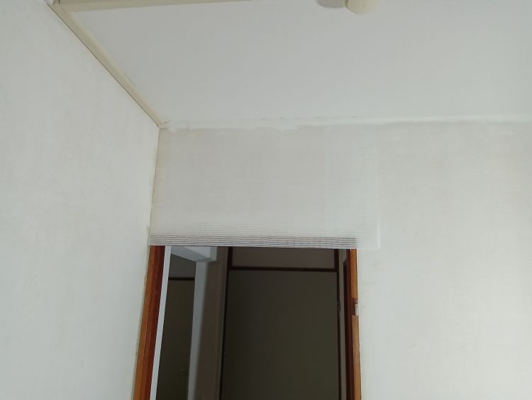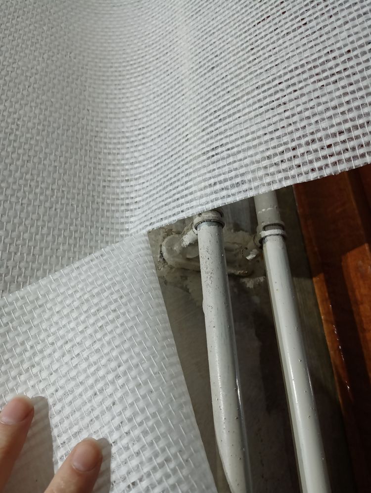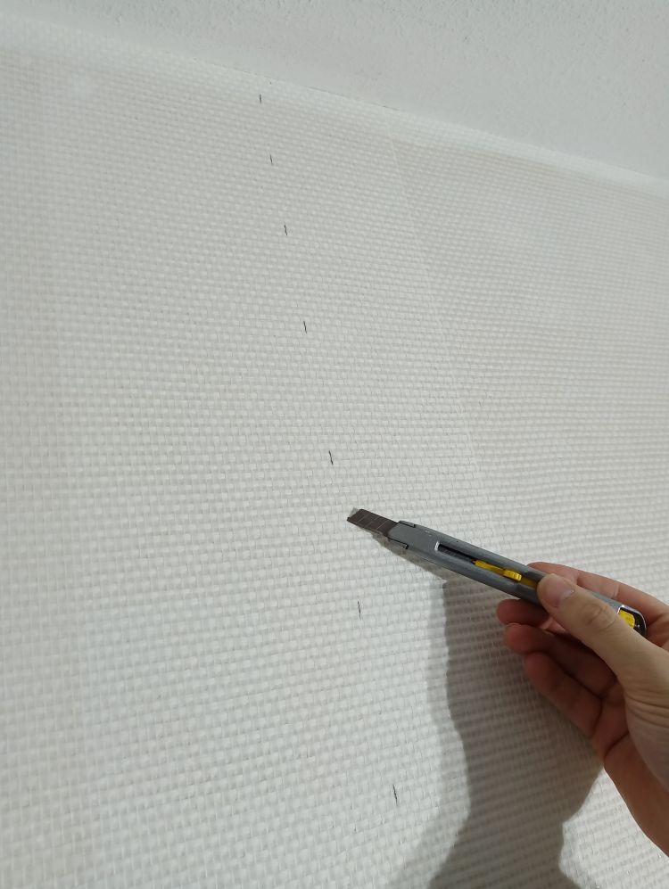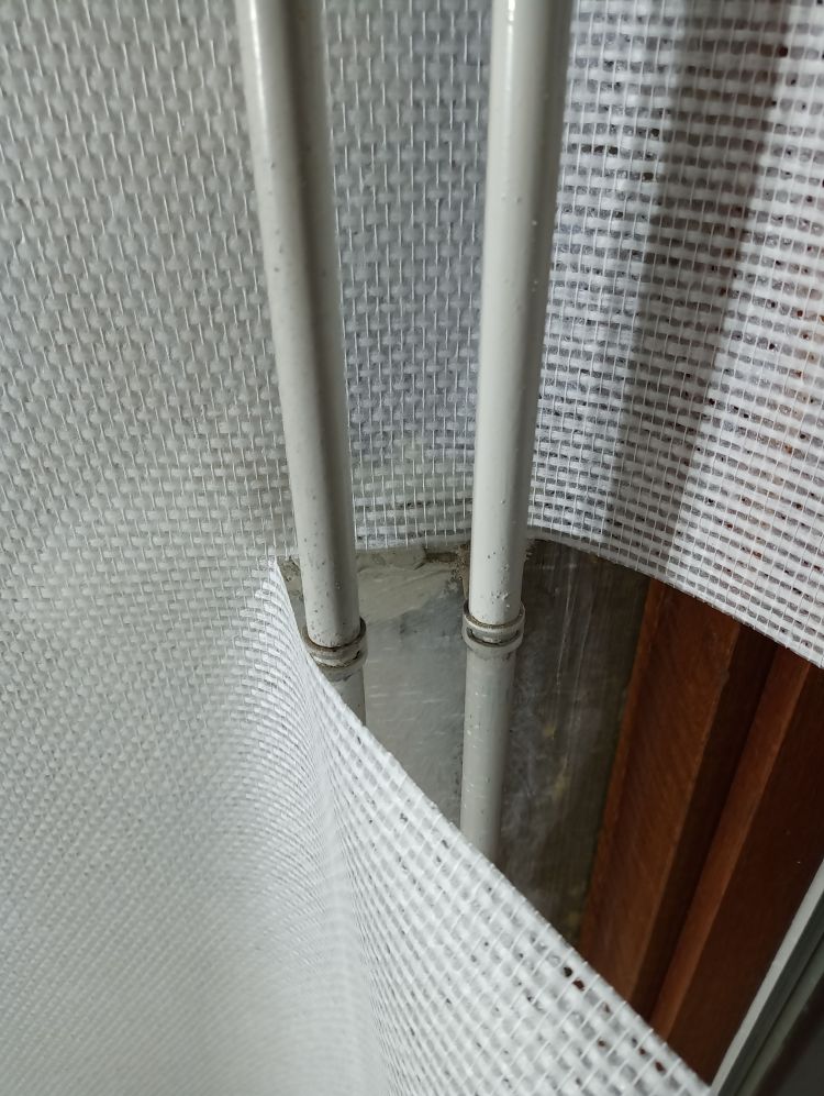 Op deze wijze ben ik doorgegaan tot het laatste stuk van de muur, waar radiatorbuizen over de muur liepen. Dit zijn de ‘lastige’ stukken, maar als je weet hoe je moet werken valt het reuze mee. Begin te plakken van de baan aan de vorige baan zoals hierboven uitgelegd. Smeer royaal plaksel met de radiatorkwast achter alle obstakels langs en alle hoeken. Smeer dan de rest in met de roller zoals je eerder ook gedaan hebt. Plak de baan vast aan de muur tot het obstakel begint. In dit geval is dat de beugel die de radiatorbuizen vasthoudt tegen de muur. Druk het behang zover mogelijk tegen het obstakel aan en markeer dit punt. Vanaf dit punt ga je namelijk horizontaal de baan insnijden tot aan het einde van de baan. Hierdoor kan je de bovenhelft over het obstakel heen drukken en de onderste helft eronder. Heb je meerdere obstakels of hele brede, dan zul je meerdere insneden moeten maken. Zodra je insneden hebt gemaakt kan je het behang achter het obstakel langs duwen, in mijn geval dus de radiatorbuizen. Wees niet te bang met het behang ergens achterlangs duwen en/of trekken. Glasweefsel is erg sterk en zal niet snel scheuren dus er mag gepaste kracht bij gebruikt worden. Ik gebruik hier de behangspatel voor tot er een puntje van het behang achter de buizen vandaan komt en ik deze kan vastpakken en verder kan trekken. Maar duw niet met de punt van de spatel, want dan kan je vezels beschadigen of er een opening in duwen door de vezels te verplaatsen.