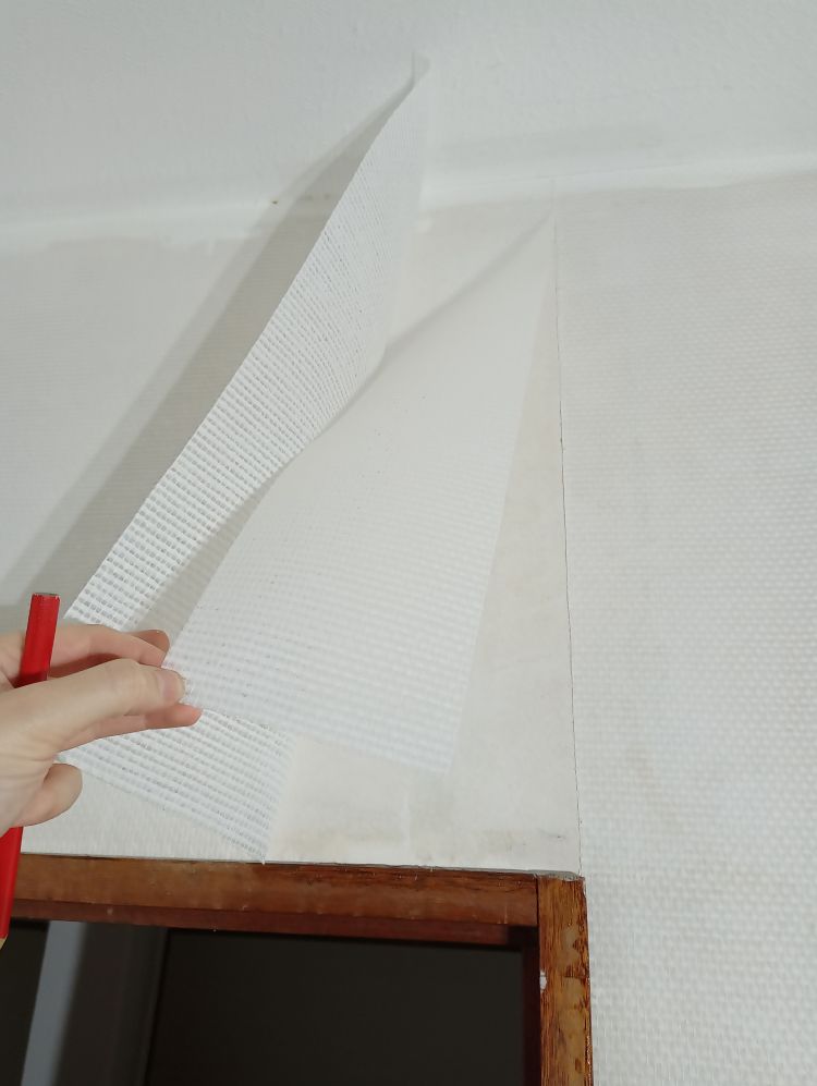 De overlap op de andere muur wordt afgesneden om ervoor te zorgen dat de hoek klaar is om gekit te worden. Het afsnijden van het geplakte behang doe ik met een klein breekmesje uit de losse hand. Als je dit te spannend vind en bang bent om fout te snijden kan je ook de behangspatel in de hoek drukken en deze gebruiken als afsnijdgids.